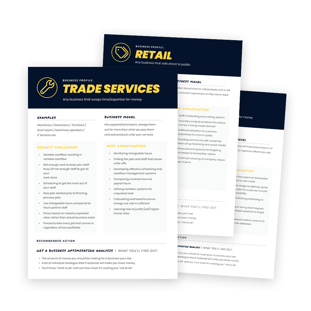 Each Cheat Sheet spells out on a single page how to Optimise Your Income including the Biggest Challenges and Best Opportunities for each business type…